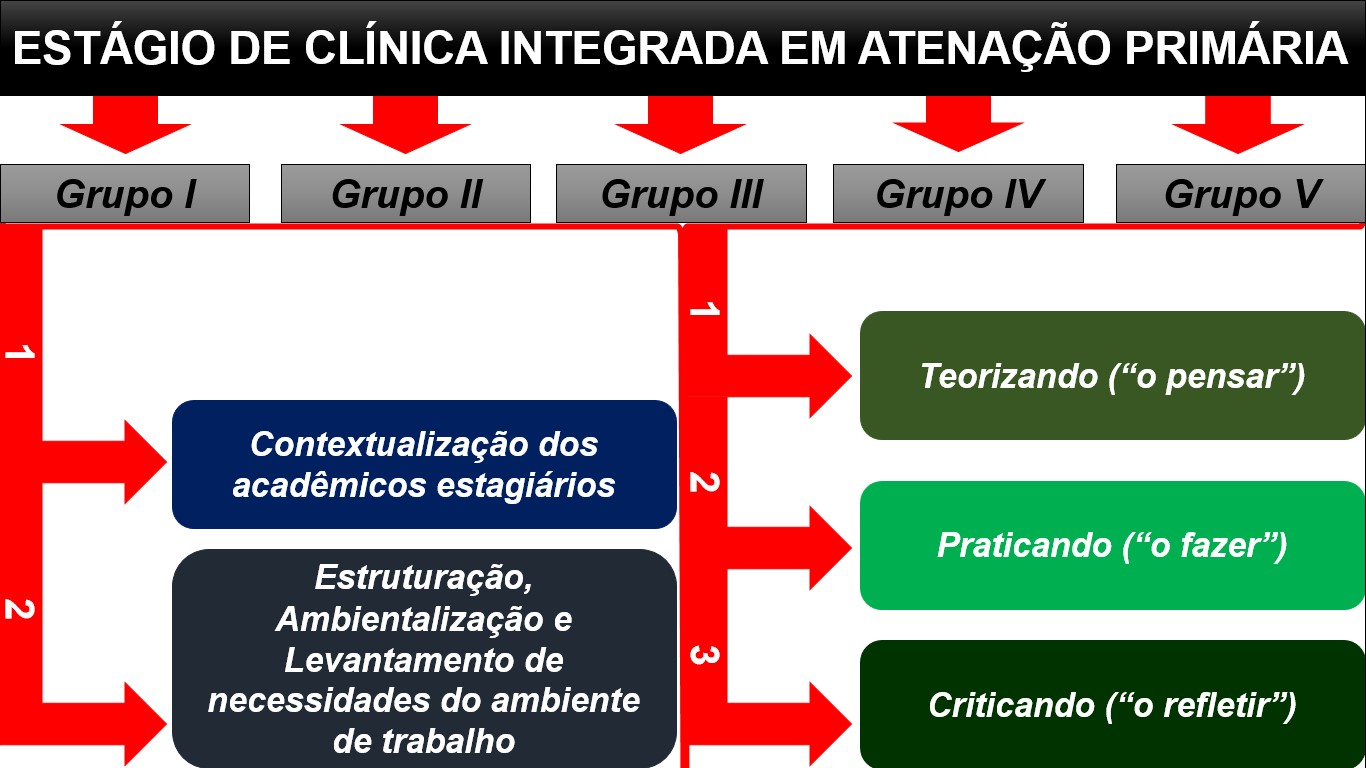 Objetivo: analisar as significâncias político-pedagógicas de experimentações de um estágio odontológico. Metodologia: estudo qualitativo, narrativo-descritivo e argumentativo. Resultados: o “Estágio de Clínica Integrada em Atenção Primária” foi didaticamente sistematizado em dois períodos, “Pré-intervenção” e “Intervenção”. Do primeiro, se desvendaram duas ações, a “Contextualização dos acadêmicos estagiários” e a “Estruturação, Ambientalização e Levantamento de necessidades do ambiente de trabalho”. Já o segundo foi guiado pelo instrumento “TPC” (Teorizar-Praticar-Criticar), onde todas as ações seguiram a lógica do planejamento estratégico, ou seja, contextualizadas ao cenário de prática (ambiente escolar). Conclusão: das vivências algumas inferências se destacaram: a efetividade do instrumento “TPC” no planejamento estratégico de ações de educação em saúde; o reconhecimento do ambiente escolar como território fértil para ações promotoras de saúde; a importância de se disseminar, em espaços científicos, os aprendizados advindos de experimentações práticas de estágios.