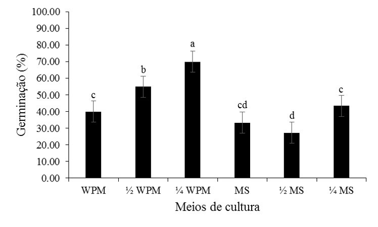 Candeia (Eremanthus erythropappus) é uma espécie nativa do Cerrado que apresenta potencial econômico para a indústria madeireira e farmacêutica. Entretanto, a taxa de germinação ex vitro das sementes é considerada baixa. Neste contexto, objetivou-se estabelecer um protocolo para germinação e multiplicação in vitro, visando a rápida multiplicação da espécie. Para a germinação in vitro foram testados os meios de cultura WPM; ½ WPM; ¼ WPM; MS; ½ MS e ¼ MS. Além disso, também foram testadas concentrações de GA3 (0,0; 0,2; 0,4; 0,6; 0,8 mg L-1) e níveis de pH (4,8, 5,8 e 6,8) no meio de cultura ¼ WPM. Para a multiplicação in vitro, segmentos caulinares foram inoculados em meio de cultura ¼ WPM, suplementado com BAP (0,0; 1,0; 2,0; 3,0; 4,0 e 5,0 mg L-1). Brotações obtidas in vitro foram individualizadas e inoculadas em meio de cultura ¼ WPM, suplementado com AIB (0,0; 1,0; 2,0; 3,0; 4,0 mg L-1) e 1,5 g L-1 de carvão ativado para o enraizamento in vitro. As brotações foram transferidas para tubetes contendo Plantmax® para posterior aclimatização. Conclui-se que o meio de cultura mais eficiente para a germinação in vitro de candeia é o ¼ WPM suplementado com 0,56 mg L-1 de GA3, e nível de pH 4,8. Para a multiplicação deve ser utilizado o meio ¼ WPM suplementado com 2,8 mg L-1 de BAP e 3,1 mg L-1 de AIB. As plantas apresentaram 70% de aclimatização ex vitro.Downloads