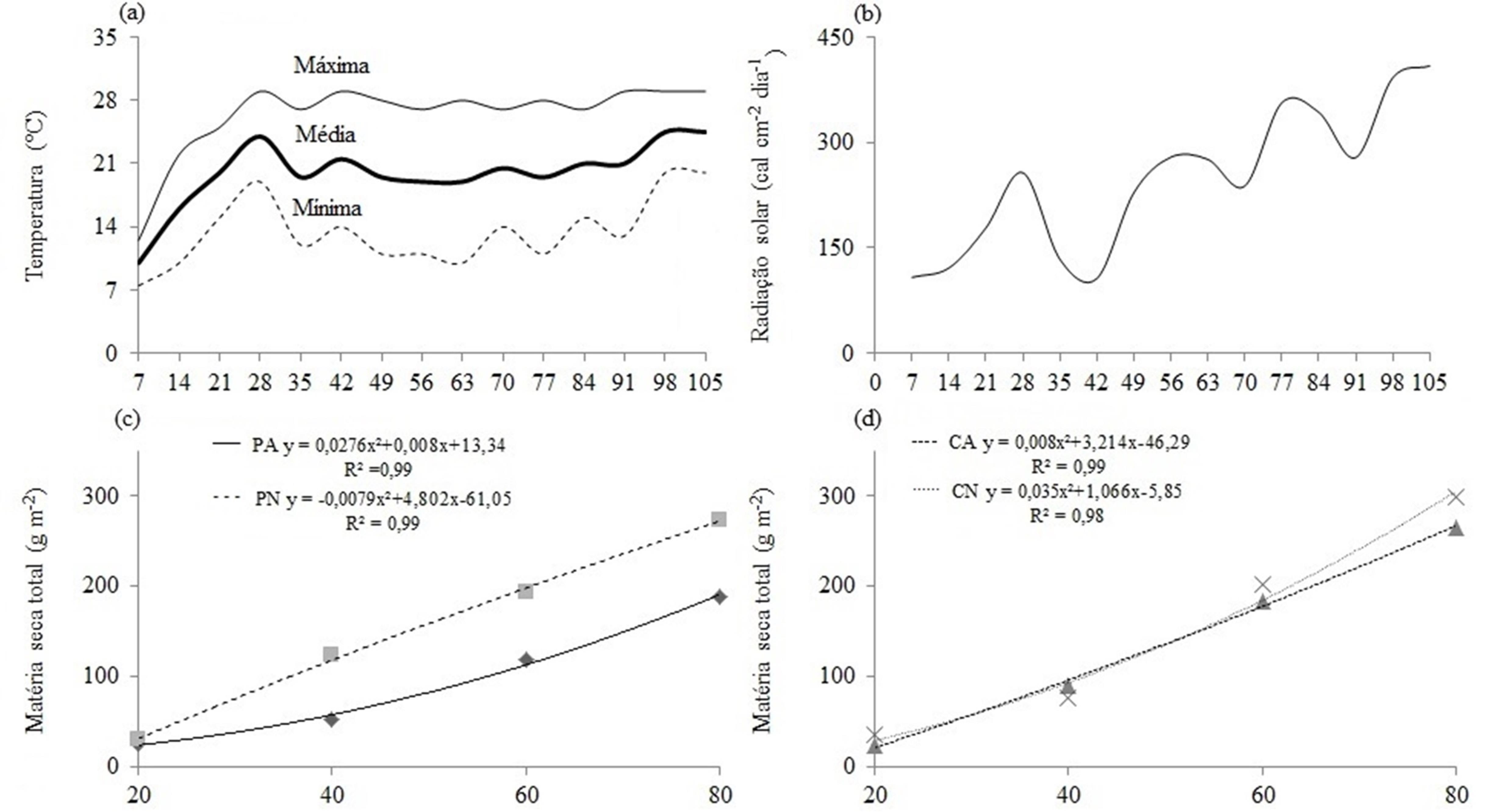 - Figura 1 - Temperaturas (a), radiação solar (b) e matéria seca total (c; d) dos genótipos IPR Tuiuiú (PA; PN) e Carioca (CA; CN) sob 12 horas de alagamento, respectivamente (Pelotas, RS, UFPel – 2014).