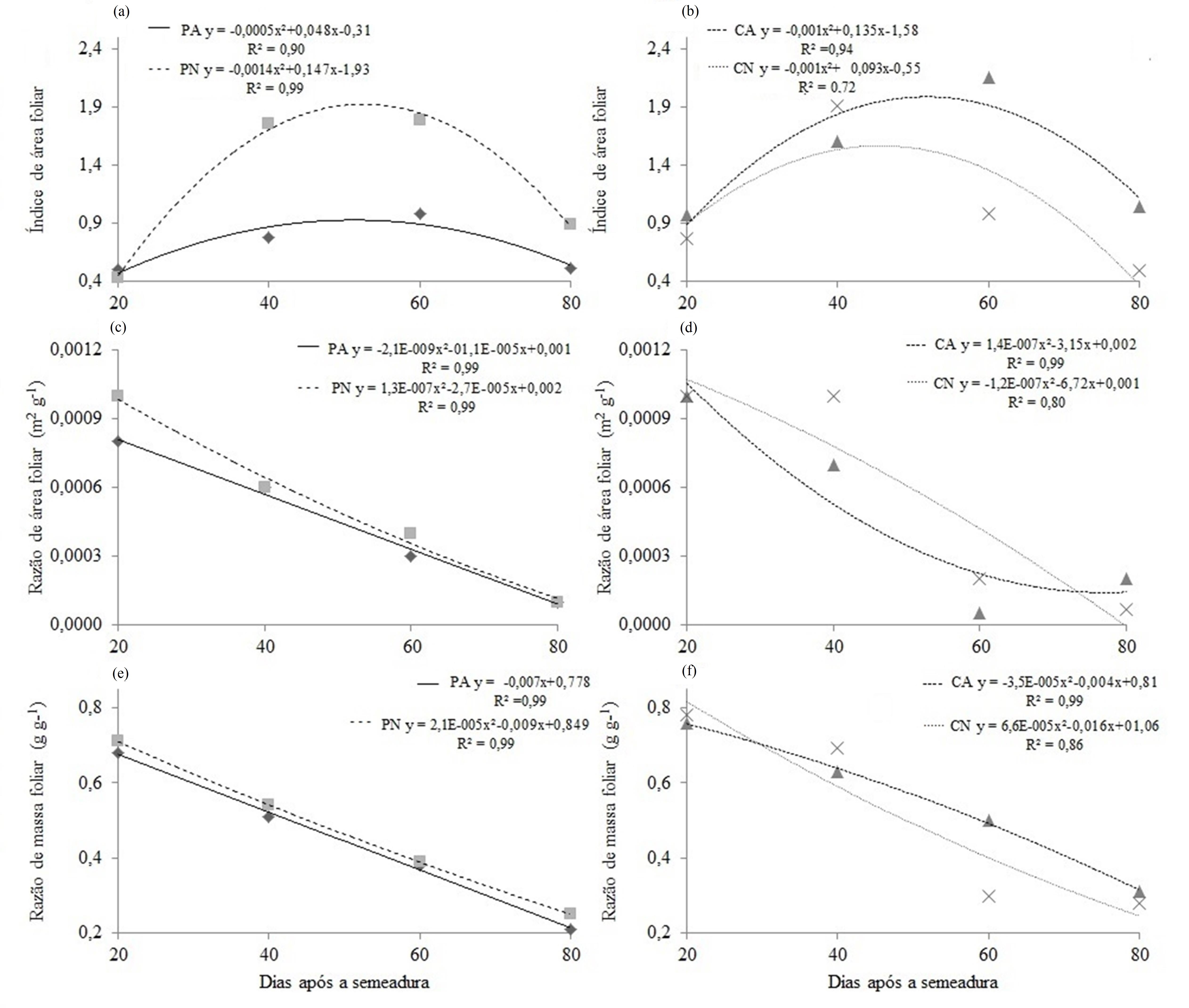 - Figura 2 - Índice de área foliar (a; b), razão de área foliar (c; d) e de massa foliar (e; f) dos genótipos IPR Tuiuiú (PA; PN) e Carioca (CA; CN) sob 12 horas de alagamento, respectivamente (Pelotas, RS, UFPel – 2014).